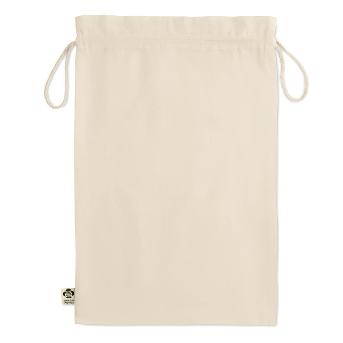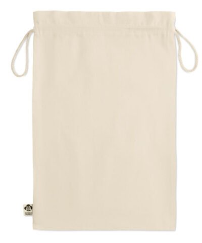Large gift draw cord bag in organic cotton. Size approx. 30 x 47 cm. 105 gr/m².