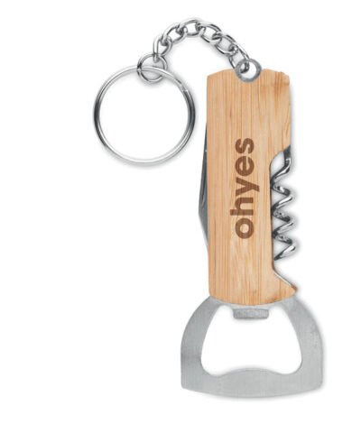 3 in 1 tool pocket with bamboo case and key ring. It includes a bottle opener, wine corkscrew opener and pocket knife.