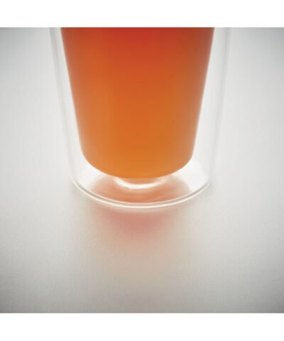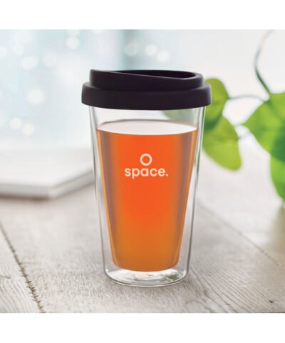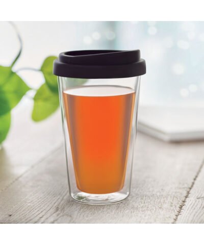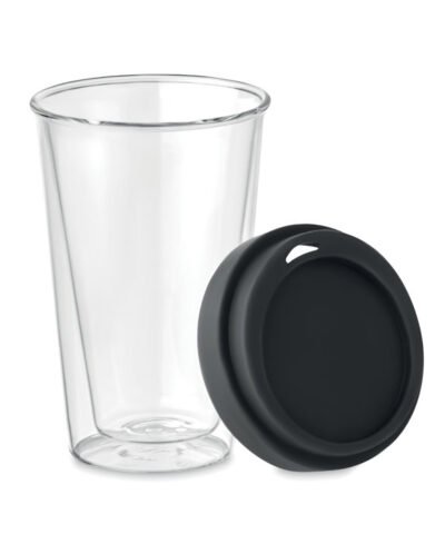 Double wall high borosilicate glass with silicone lid. Capacity 350ml