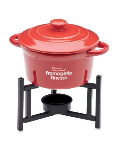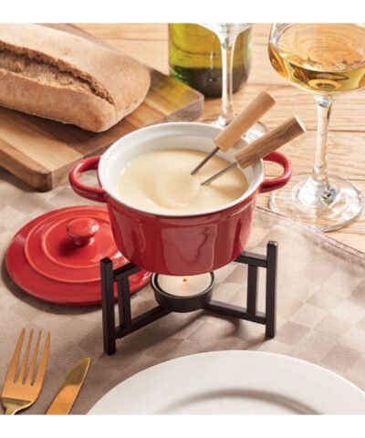 Small ceramic fondue set with lid for two. Including 2 metal forks wit wooden handles. Tea light not included. Capacity: 300 ml.