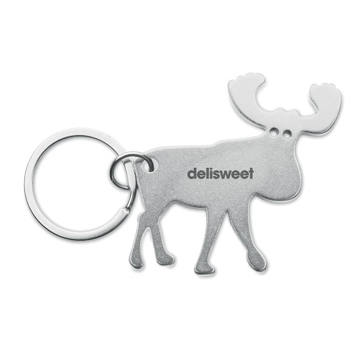Recycled aluminium key ring with bottle opener in reindeer shape.