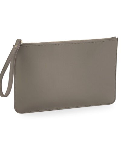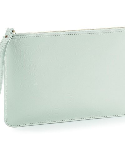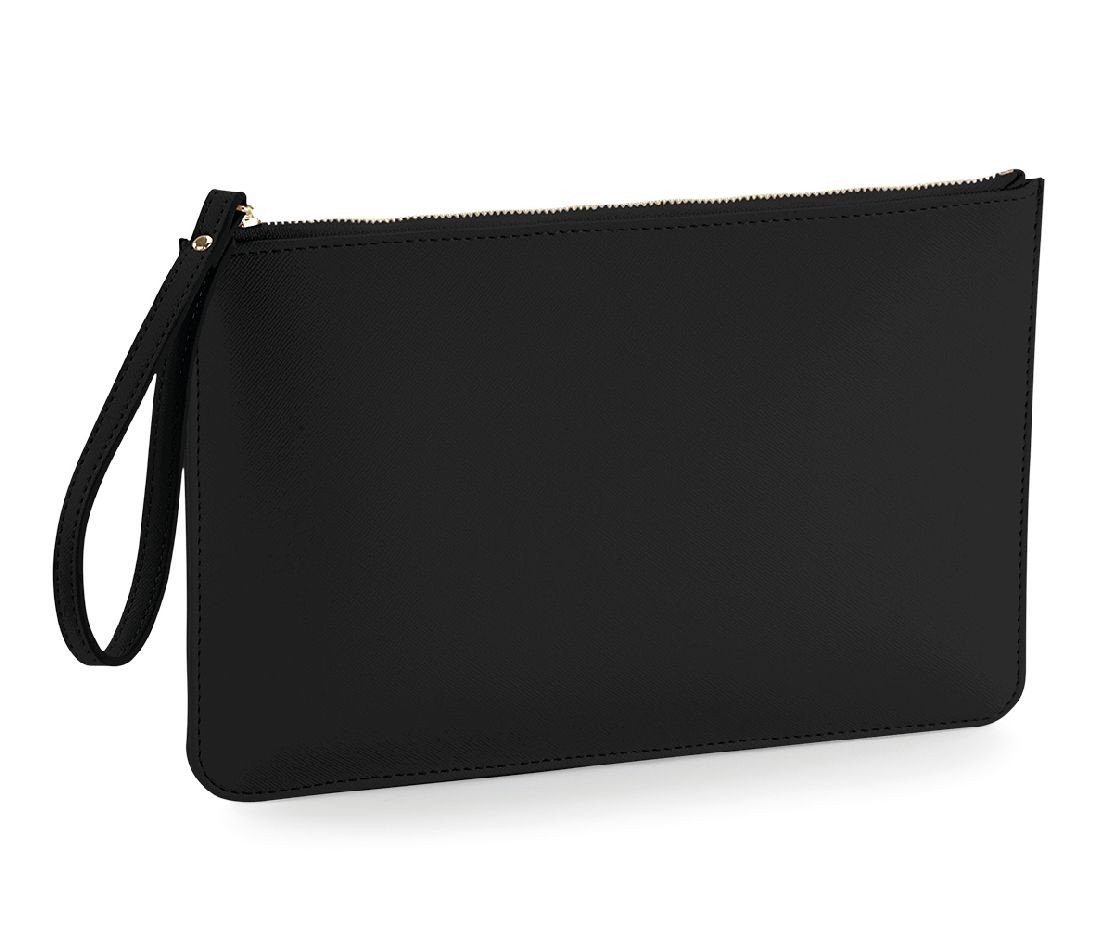 TearAway label for ease of rebranding. Saffiano fine grain. Multi-purpose use. High shine gold metal zip. Zippered main compartment. Internal foam padding. Soft-touch lining. Wristlet strap.