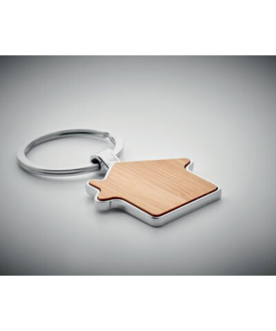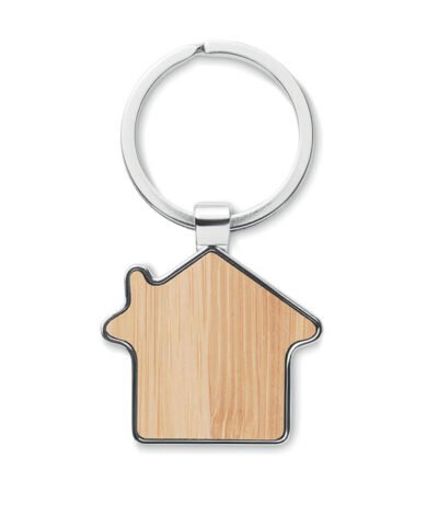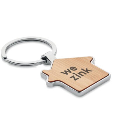 House shaped zinc alloy key ring with bamboo front. Bamboo is a natural product, there may be slight variations in colour and size per item, which can affect the final decoration outcome.