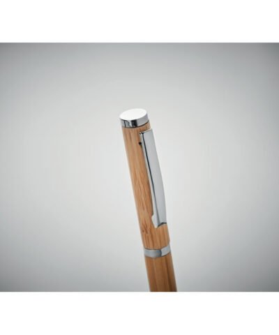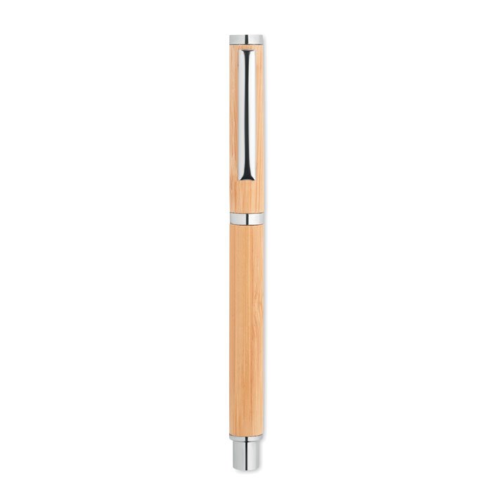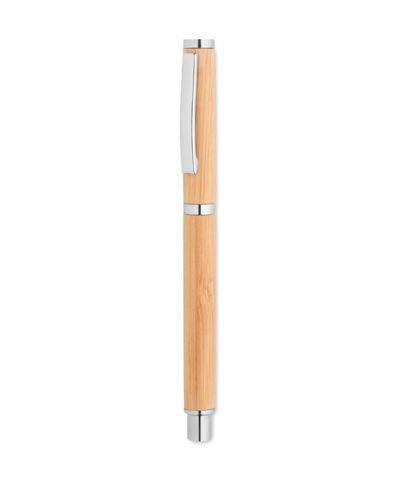 Bamboo barrel roller ball pen with stainless steel fittings. Blue gel ink. Bamboo is a natural product, there may be slight variations in colour and size per item, which can affect the final decoration outcome.