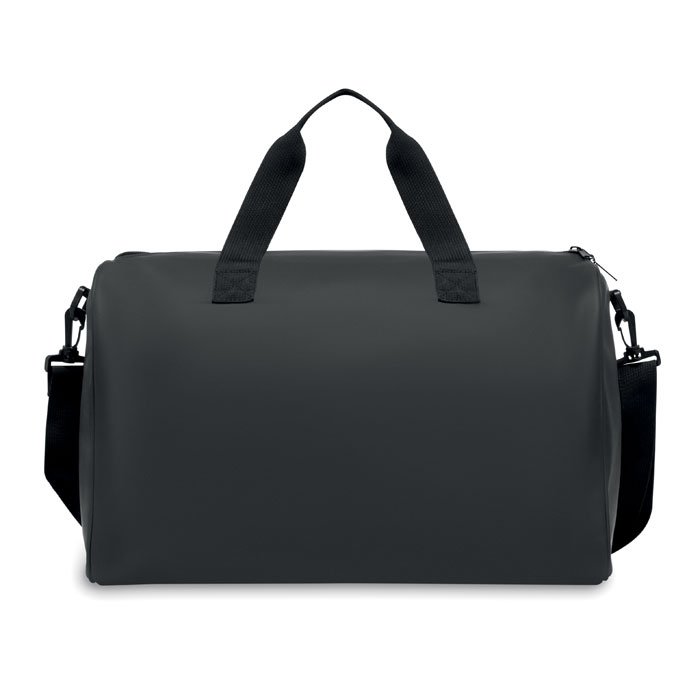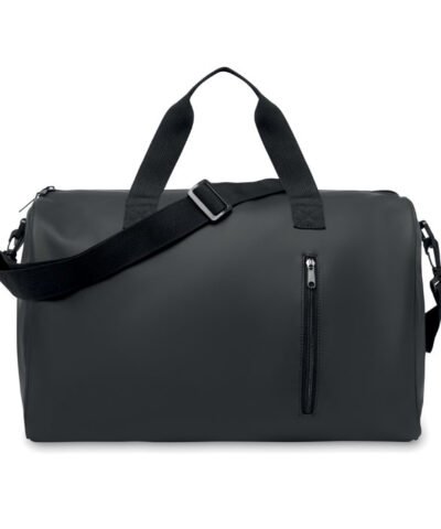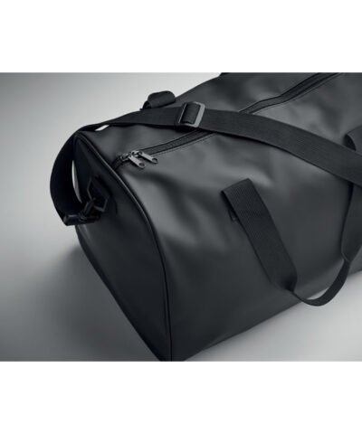 Duffle bag in soft PU with foam reinforcement to the base. One main compartment, zippered front pocket. 210D RPET polyester lining. 2 handles and one adjustable and detachable shoulder strap