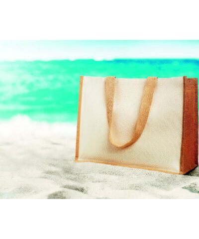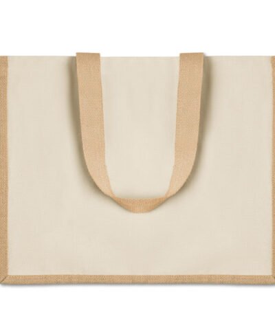 Jute shopping bag laminated with front in canvas and cotton webbing. Long handles.