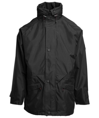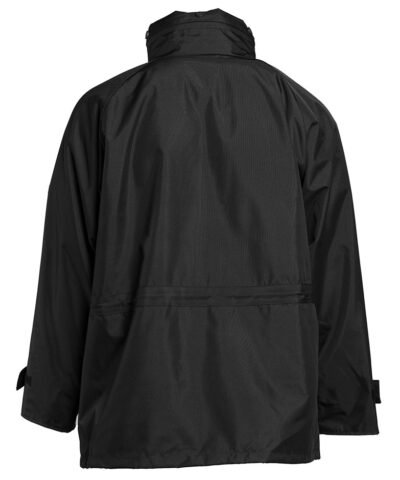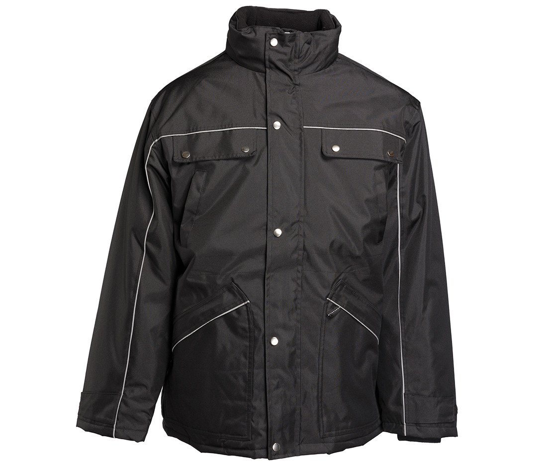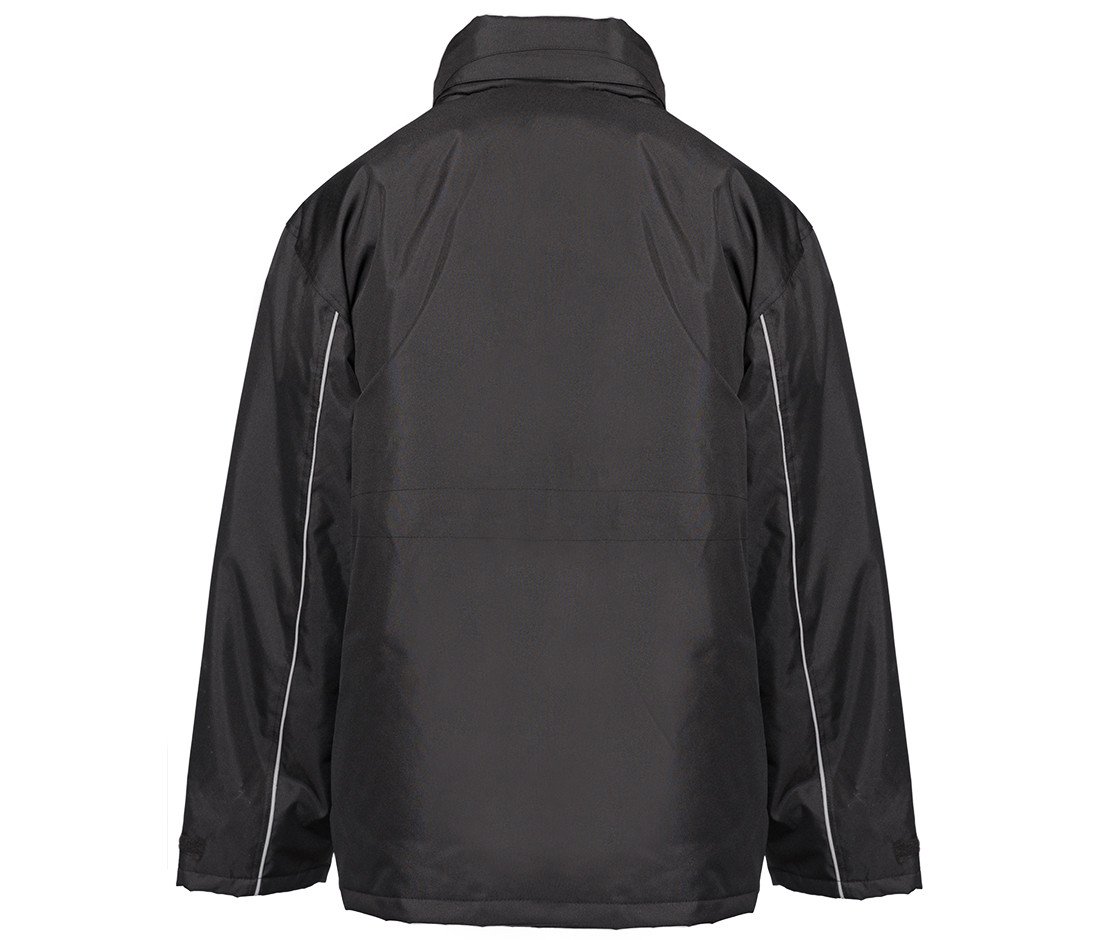 3-in-1 work jacket, windproof and waterproof. Reflective piping on front and back of sleeves. Hook and loop tab on sleeves. Hood with mountain pass in collar. Fleece lined collar. 6 pockets (
