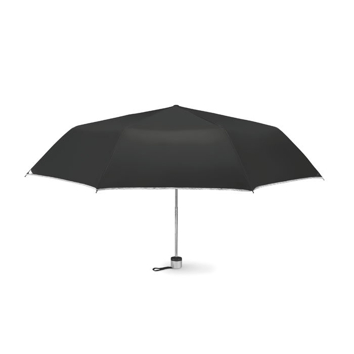 21 inch manual open umbrella in 190T polyester with zincify plating metal shaft and tips. Black plating metal ribs. Panels in colour with silver coating on back. Plastic handle in color with silver rim and black wrist strap. 3 sections fold. Includes matching pouch with silver trim. Manual closure.