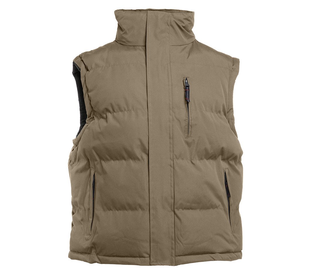 Genuine sleeveless down jacket with Weather Block+® coating. Thick and warm. Knit collar. Hood in collar. 2 zipped side pockets and 1 zipped chest pocket. 1 inside wallet pocket. Zipped pocke