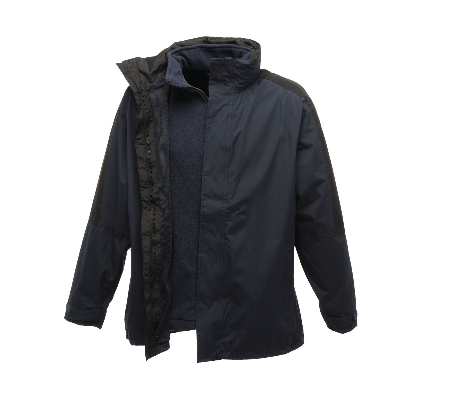 Concealed hood with adjuster. Stormflap with hook and loop. Adjustable cuffs.
