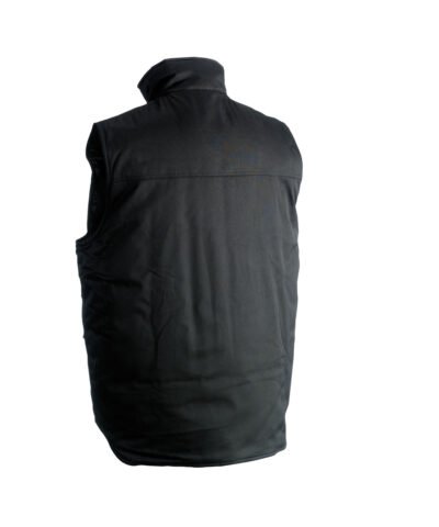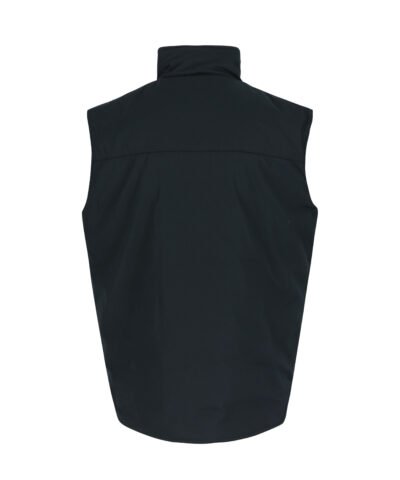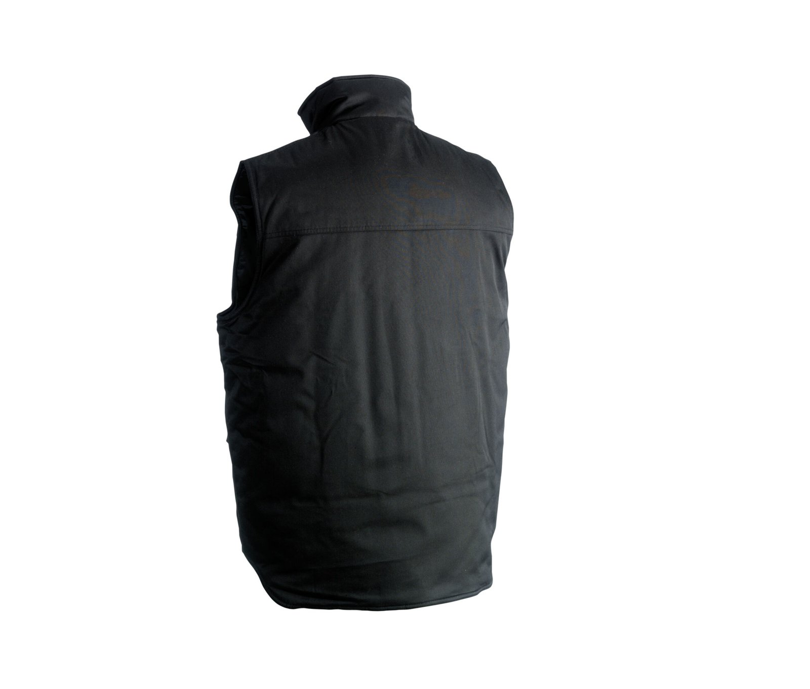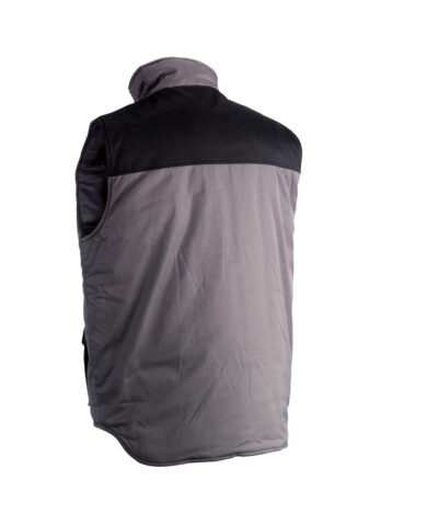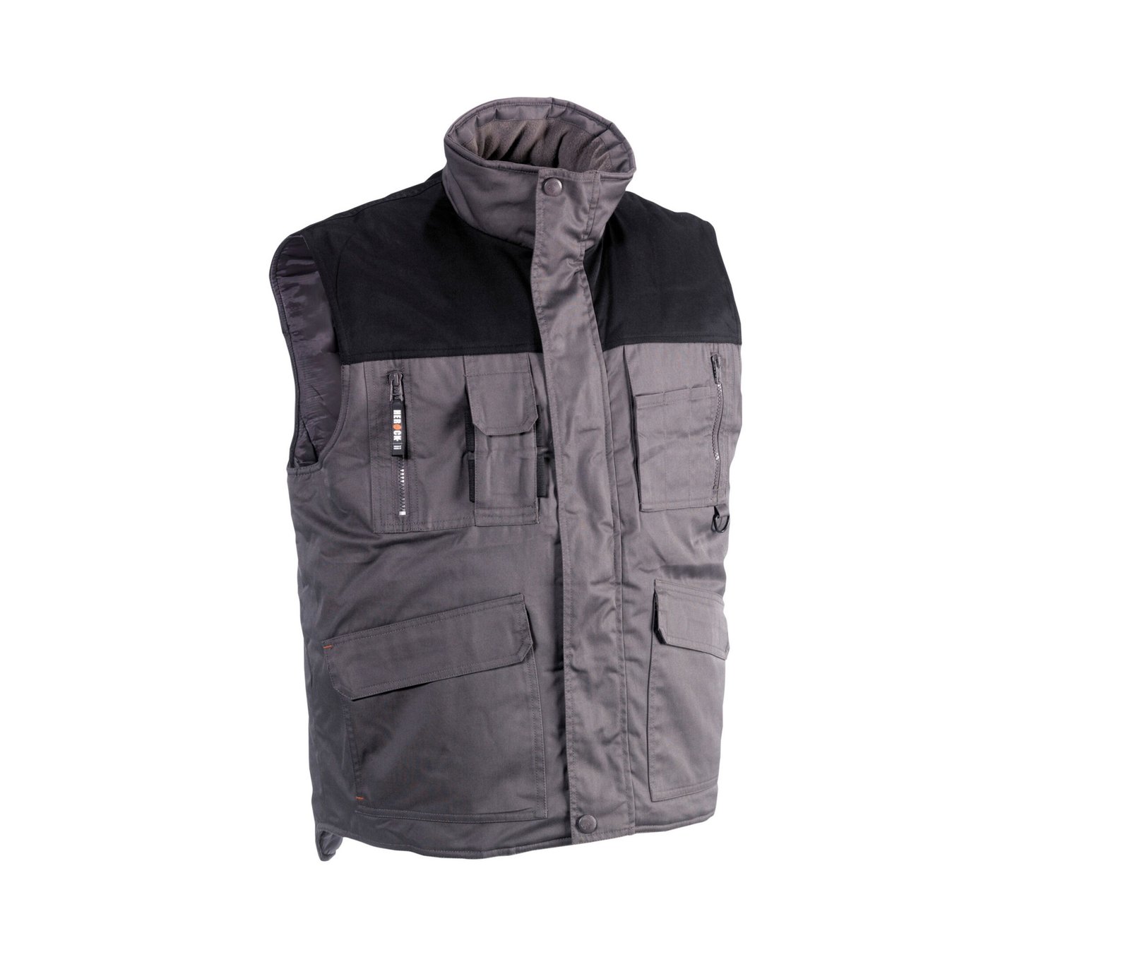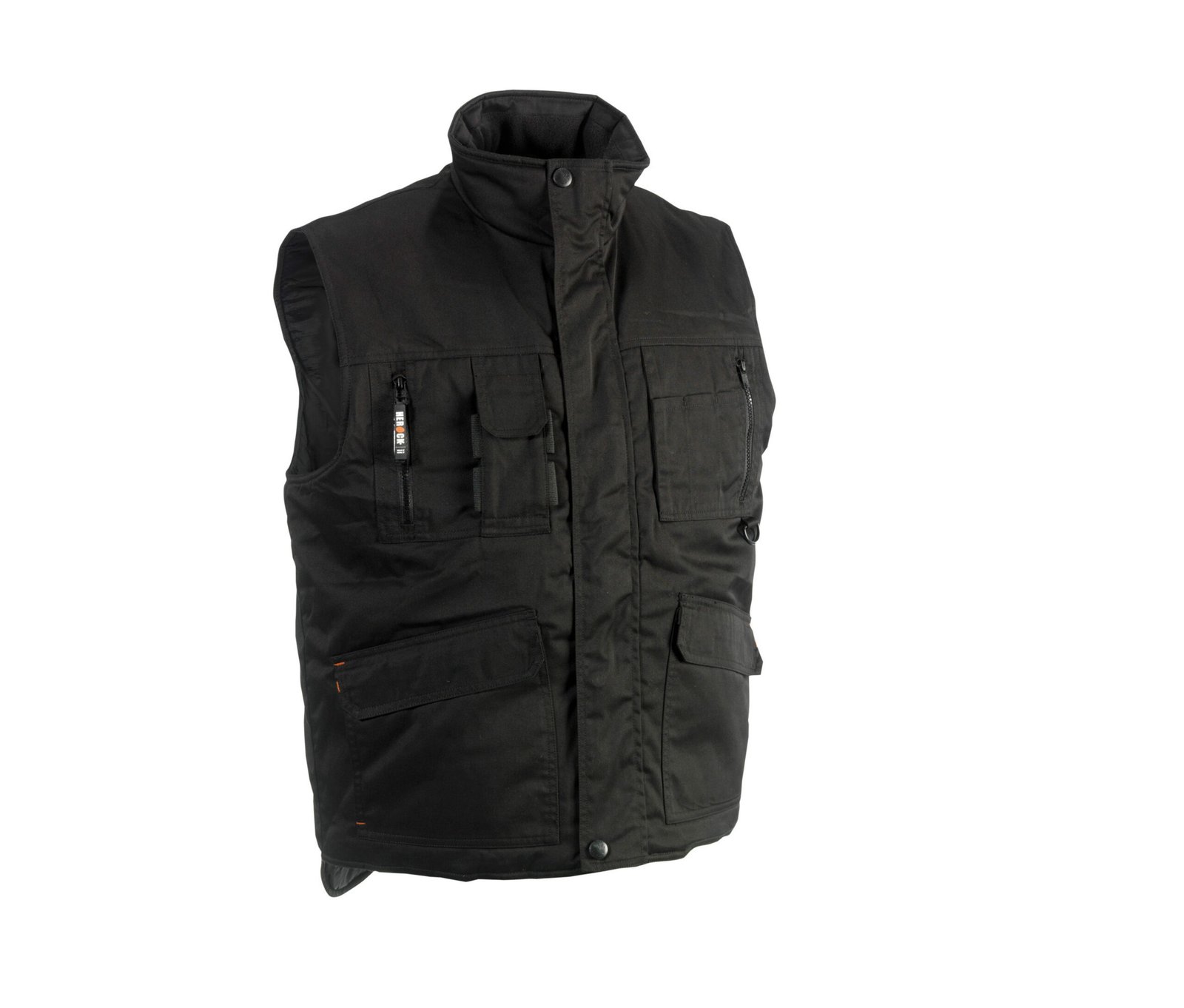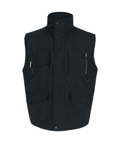 Multi-pocket water-repellent bodywarmer with fleece collar. 12 pockets. Printer zipper.