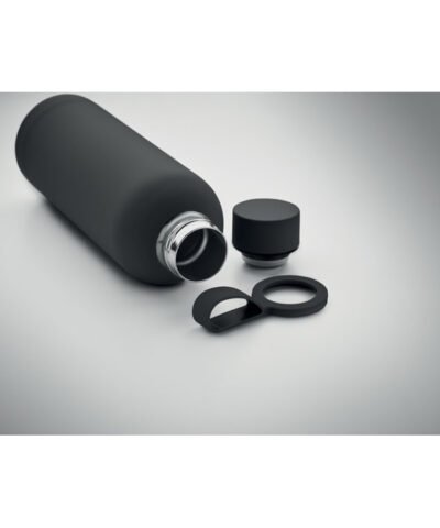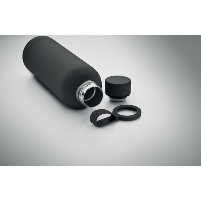 Double wall vacuum insulating bottle in recycled stainless steel (90% recycled stainless steel and 10% stainless steel) with rubber finish and silicone handle. Capacity: 500 ml.