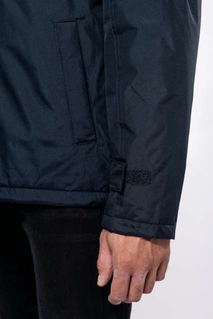 100% polyester outer with PVC coating;Polyester padding and lining;Cuff adjusters with tear release fastening;Concealed hood with elasticated drawcord and zip access;2 inner pockets and 1 mobile phone pocket;Inner zip access for decoration;Detachable sleeves;2 side pockets with piping;Elasticated drawcord with toggles at hem;
