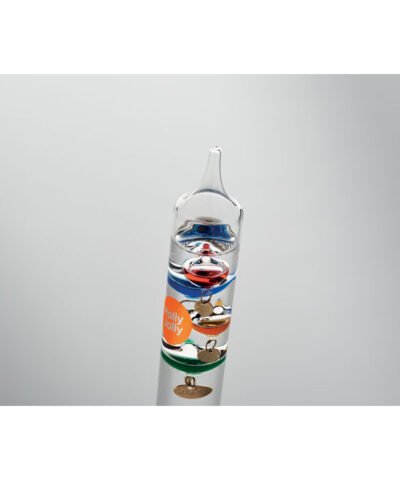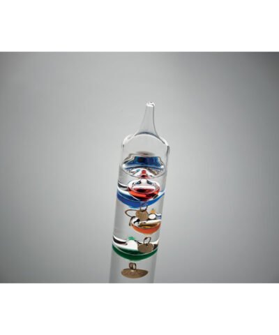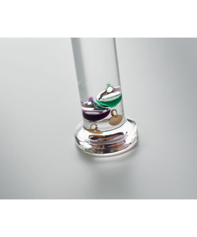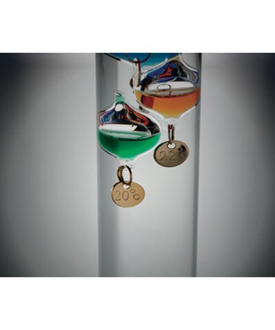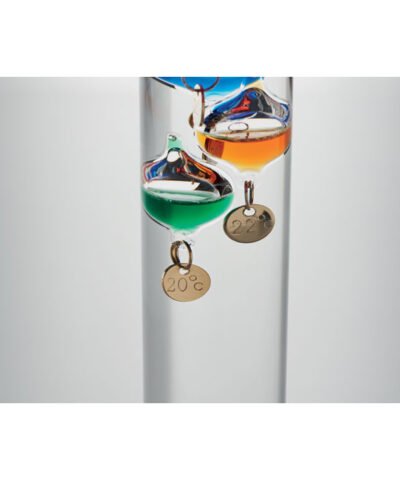 Galileo thermometer in glass with five coloured floating globes. Each globe indicates the temperature from 18°c to 26°: Red 26°, Royal Blue 24°, Orange 22°, Green 20°and Purple 18°. The lowest sphere in the top group indicates ambient temperature.
