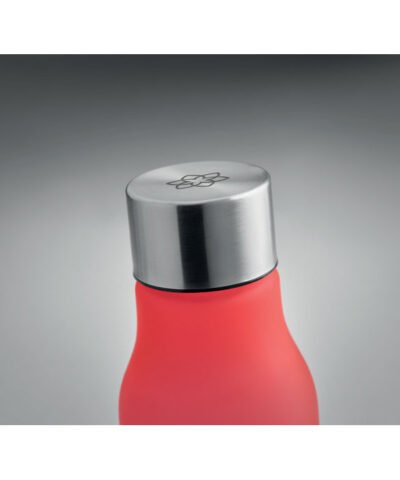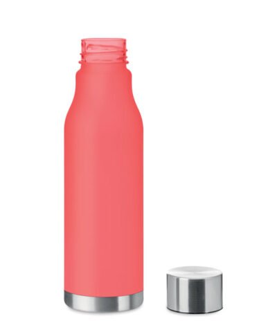 Drinking bottle in RPET with rubberised finish (frosted transparent) and stainless steel cap with inner RPET lid and silicone ring. BPA free. Leak-free. Capacity: 600 ml. Not suitable for carbonated drinks.