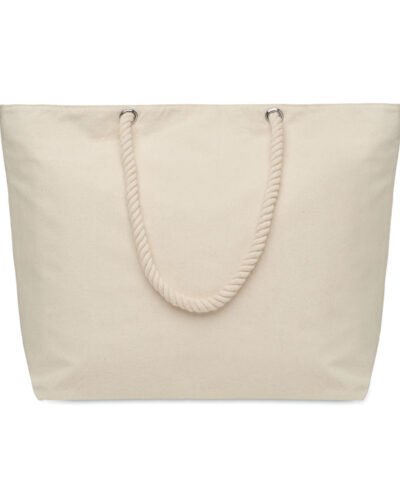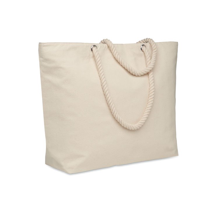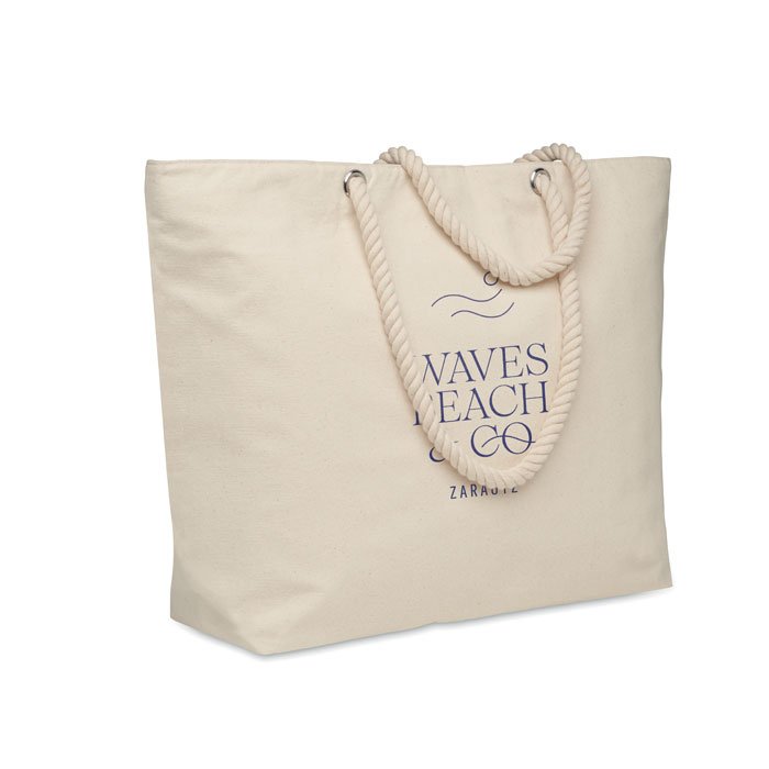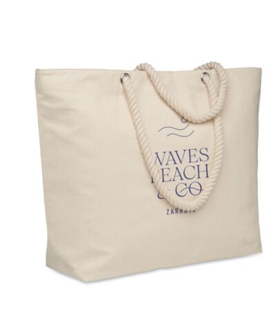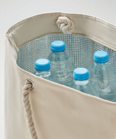 Zippered beach cooler bag in cotton with cord handle. 220 gr/m². 2mm aluminium foil insulation.