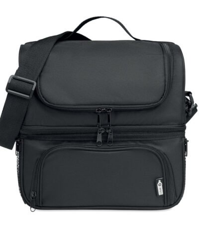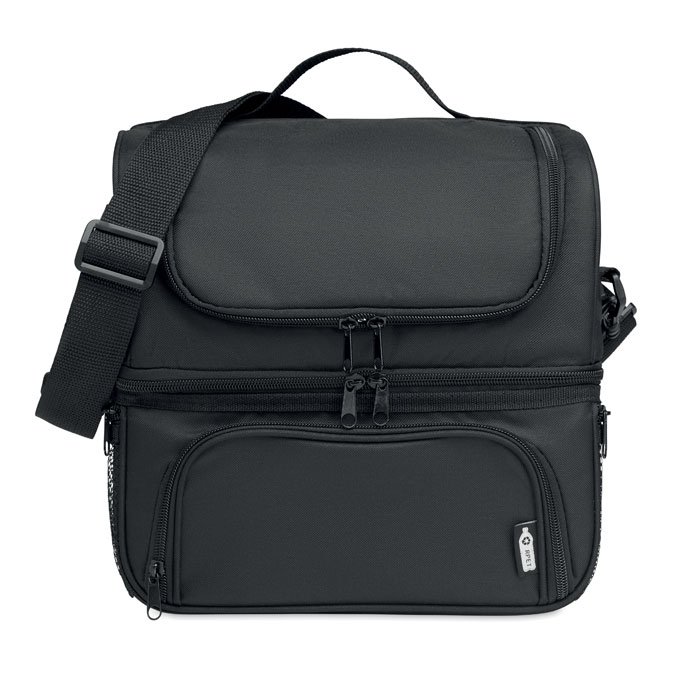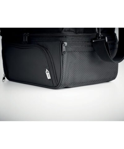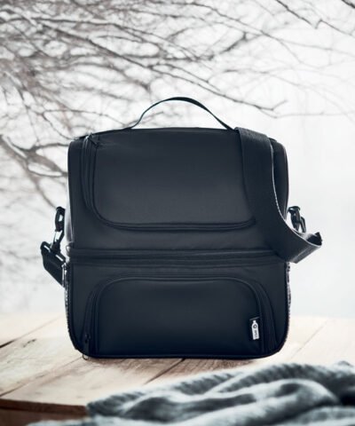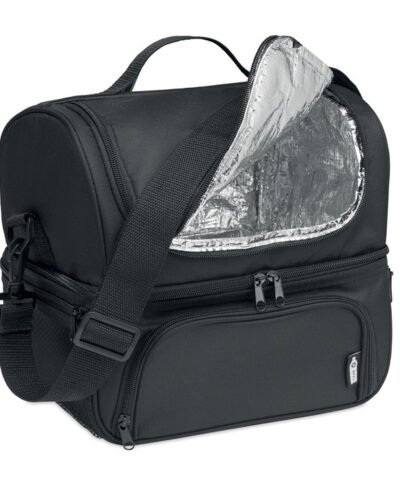 Insulated cooler bag in 600D RPET includes a reusable PP 1900ml capacity lunch box. With 2 sections to store hot and cold food separately. Adjustable and detachable shoulder strap. 2mm aluminium foil lining.