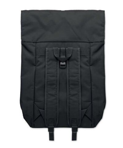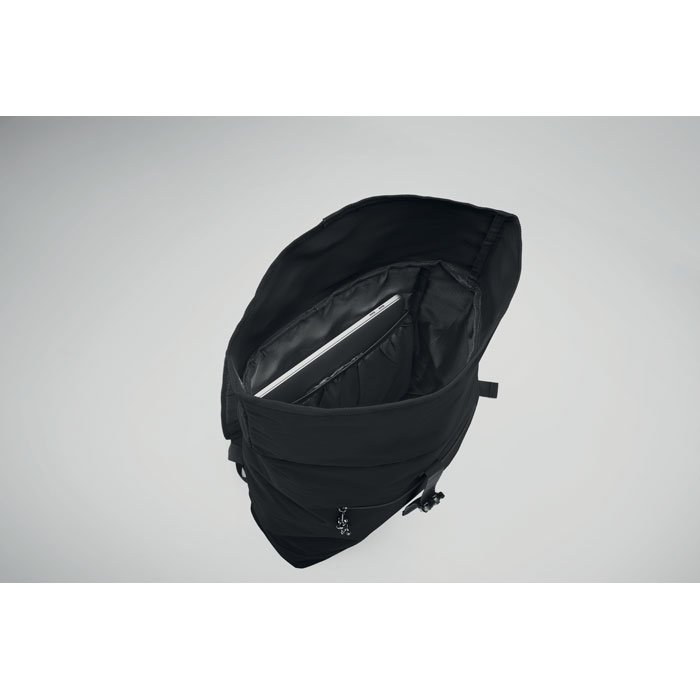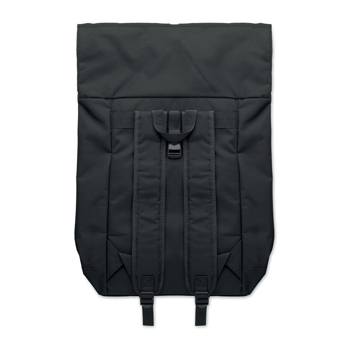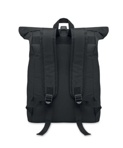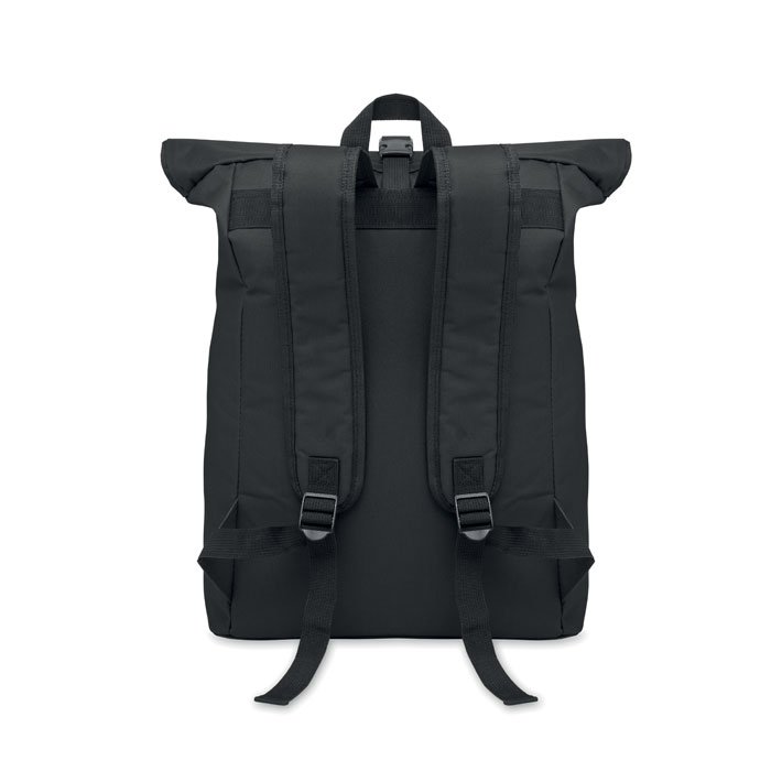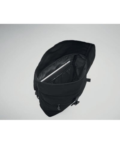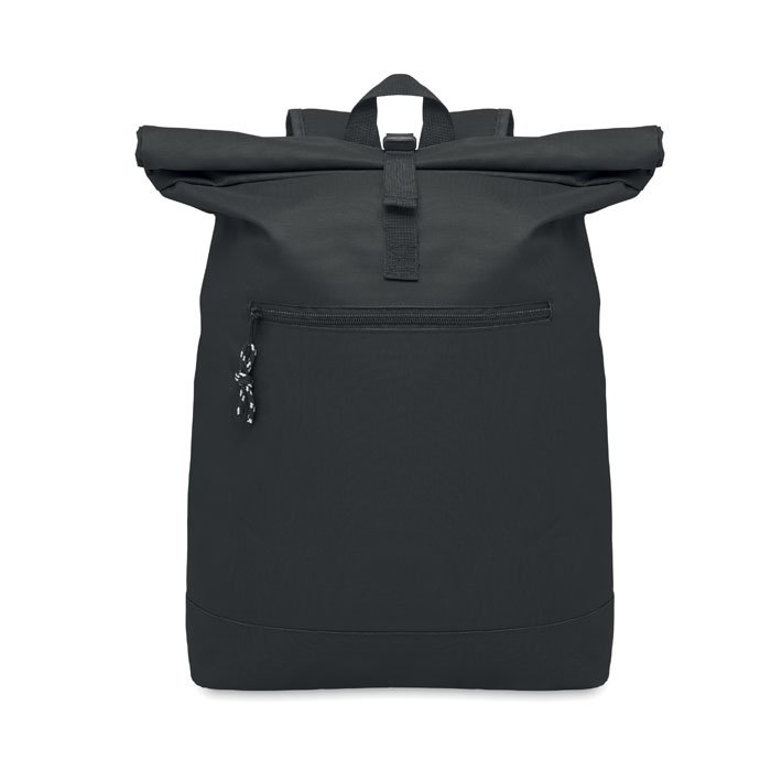 15 inch rolltop laptop backpack in 600D polyester with padded back and base reinforcement. Zippered front pocket. 210D lining.