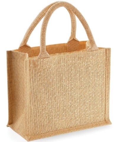 Laminated Jute. Cotton carry handles. Handle length: 30cm. Dimensions: 20x20x12cm. Capacity: 4 litres. Maximum Print Area: 15 x 10 cm