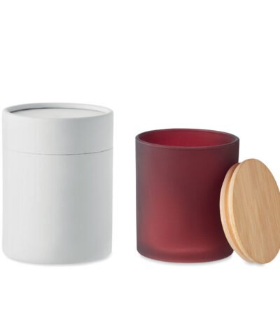 Fragranced plant based wax candle in frosted glass jar holder with bamboo lid. 200 gr. Burn time: 33 hours. Presented in a paper tube gift box. Bamboo is a natural product, there may be slight variations in colour and size per item, which can affect the final decoration outcome.
