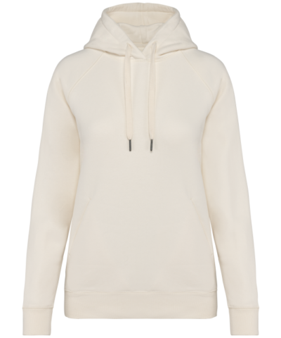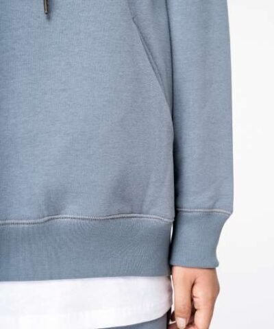 65 % organic cotton / 35 % post-consumer recycled polyester;Ringspun combed cotton;Regular fit with raglan sleeves;Brushed 3-ply fleece. LSF (Low Shrinkage Fleece);Enzyme-washed;Cover stitch on armholes. sides. bottom hem and cuffs;Two side pockets;Hood lined with main material;1/2 circle in the back;Flat drawstrings with recycled metal tips;Jersey inner taped neck;1 x 1 rib;