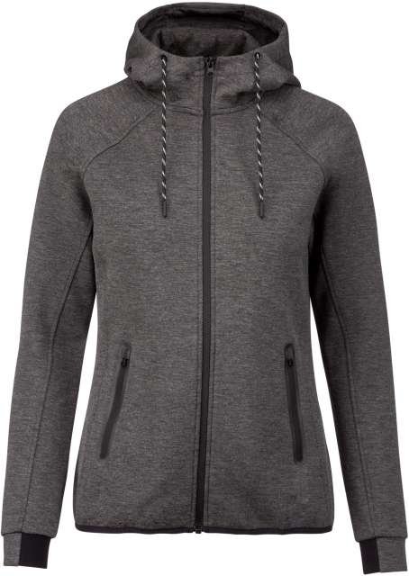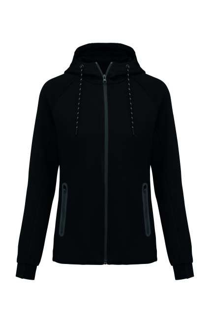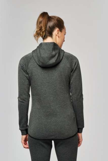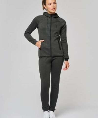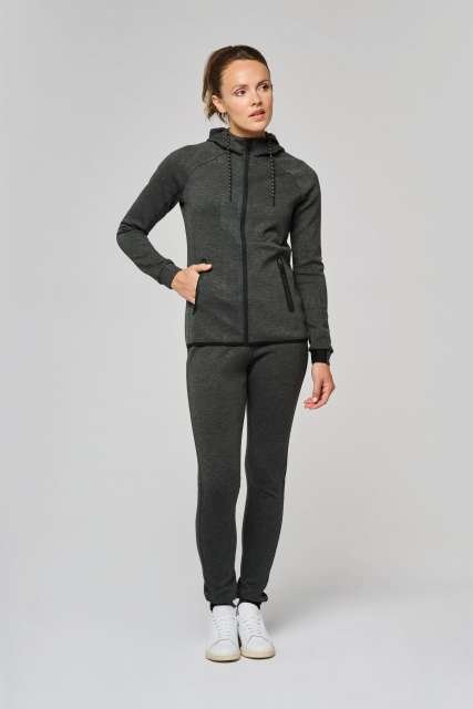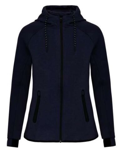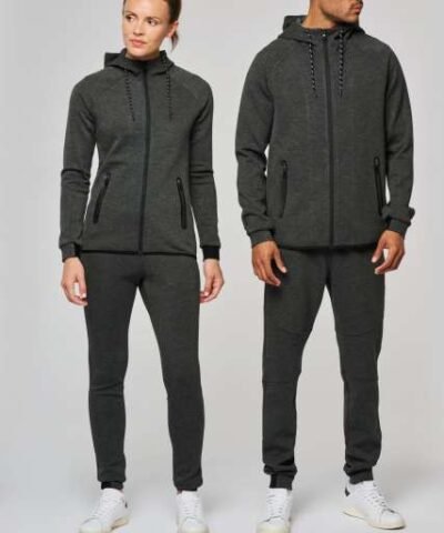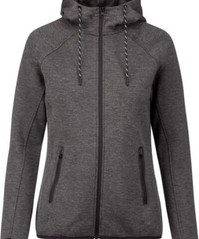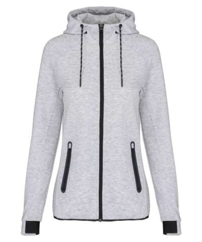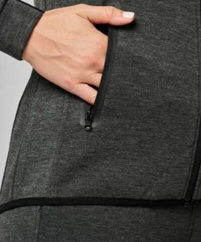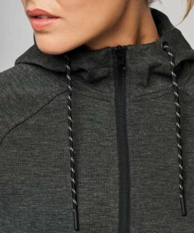 94% polyester/ 6% elastane;(Heathers colours: 79% polyester/ 15% viscose/ 6% elastane);Extremely comfortable fabric;Zip fastening;2 zipped front pockets with taped seams;Hood with 65% polyester/ 35% viscosej lining. and two-tone drawstring with plastic tips;Cuffs with contrasting elastic part;Contrasting binding at hem and contrasting zippers – Black on all colours and Dark Grey on Ash Heather;