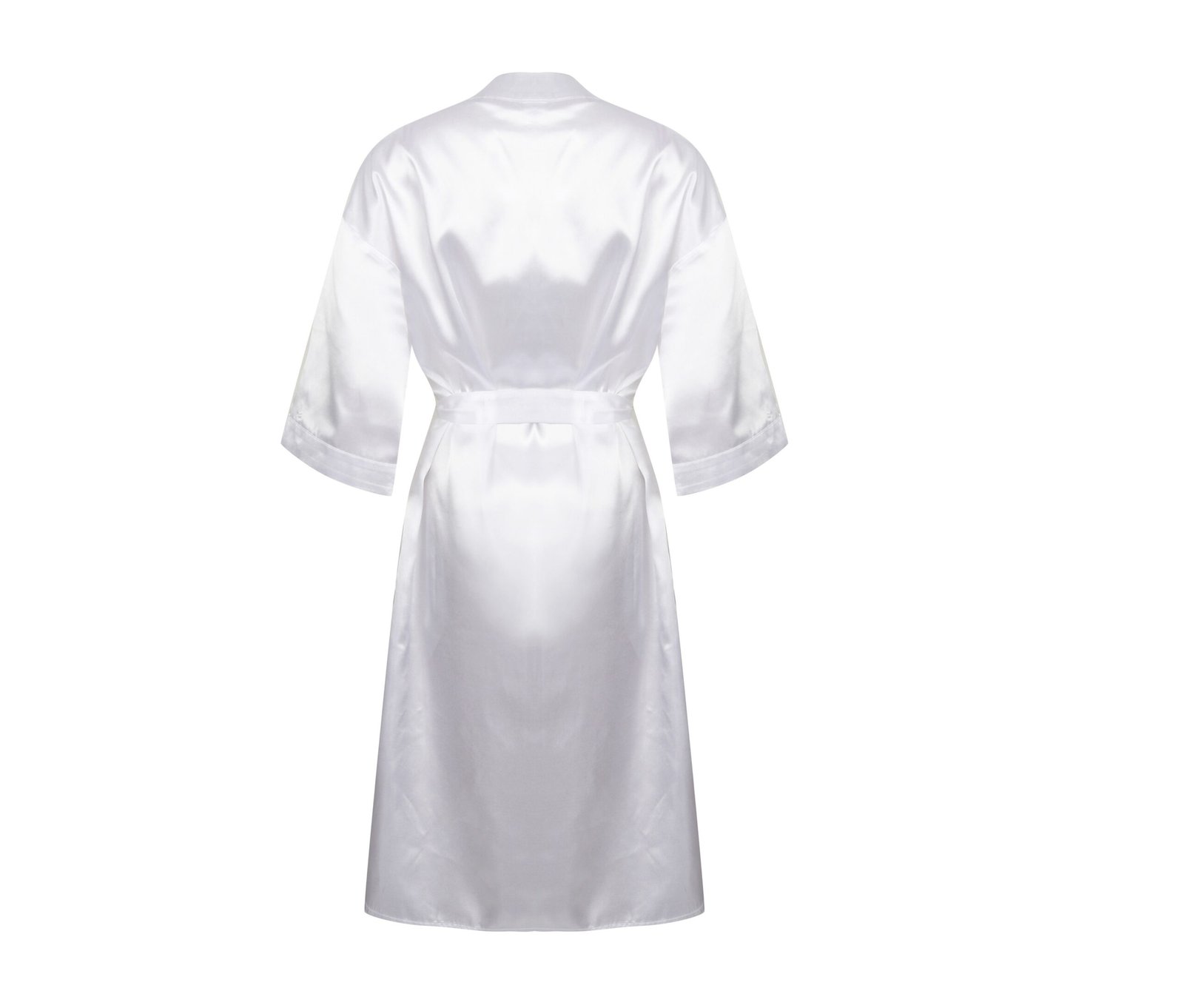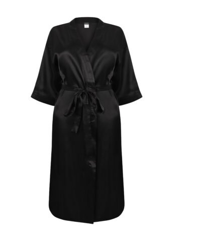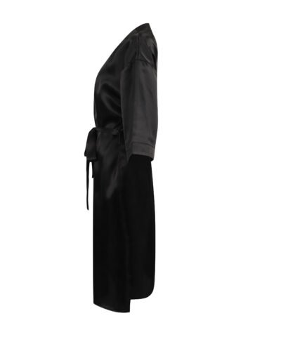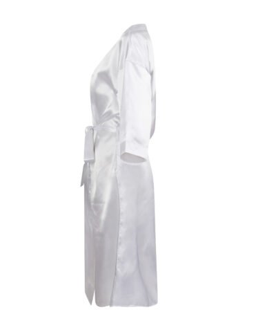 Kimono style satin bathrobe. 2 side pockets. Belt of the same material as the bathrobe. Detachable label. 3/4 sleeves. Length: under the knees.