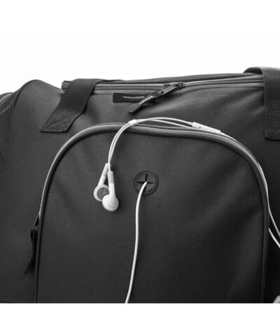 Sports bag in 600D polyester with 2 zippered side compartments and 1 zippered front pocket with earphone eyelet. Detachable and adjustable shoulder strap included.