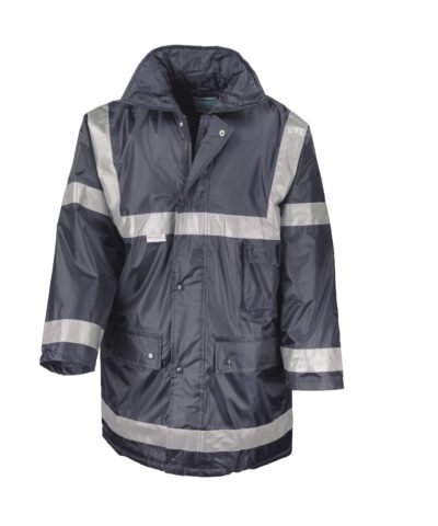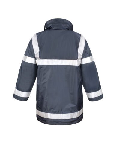 Waterproof 1600mm & windproof. Concealed adjustable hood in collar. 50mm sewn-on retroreflective tapes. Large stud closing pockets. Stud closing storm flap. Fully taped seams. Heavy duty zip.