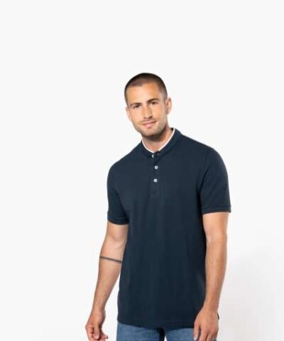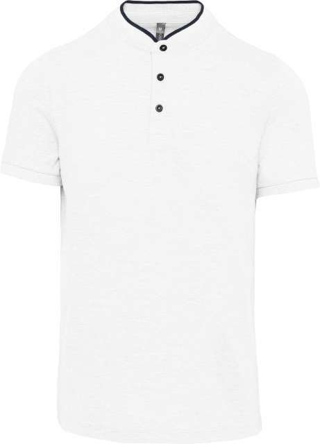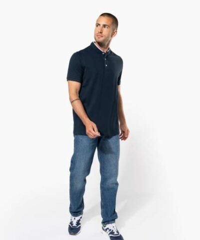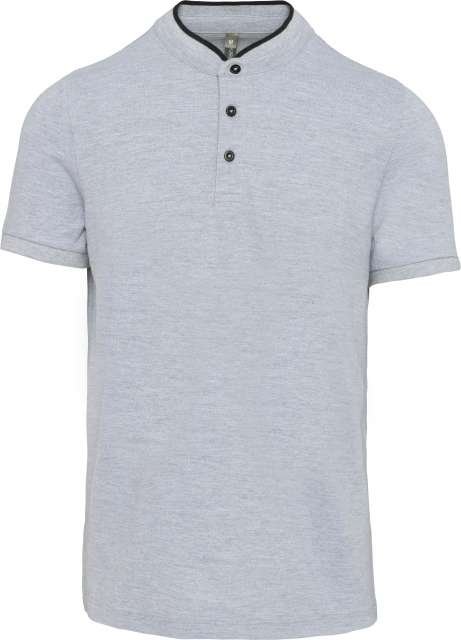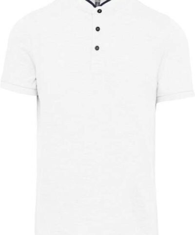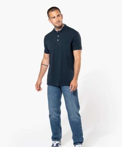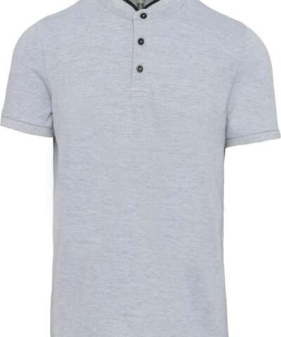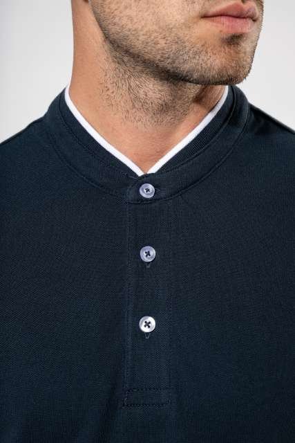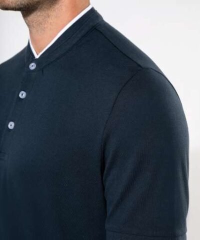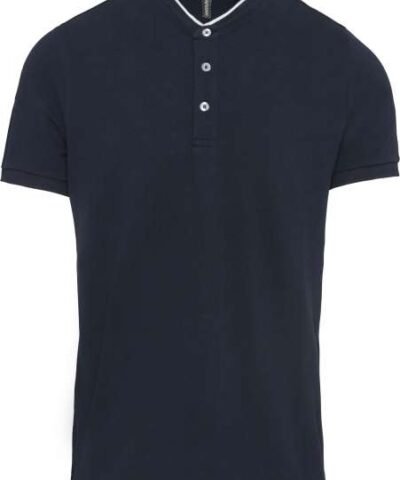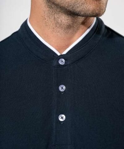 100% cotton;(90% cotton / 10% viscose for marl colourway);Piqué knit in combed cotton;Washable at 60°C (40°C for marl colourway);Ribbed Mandarin-style collar with contrasting piping;Placket with 3 contrasting buttons;Ribbed cuffs;Twin needle finish at hem;Certified STANDARD 100 by OEKO-TEX® N° CQ 1007/7. IFTH;