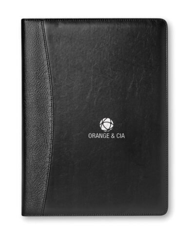 A4 faux leather portfolio. 20 lined sheets notepad. Solar powered calculator. Metal ball pen. Blue ink.