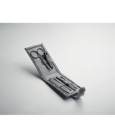 6 piece stainless steel manicure set in rectangular RPET felt pouch.