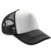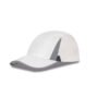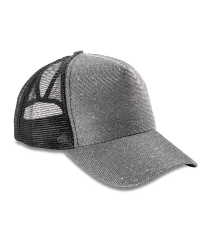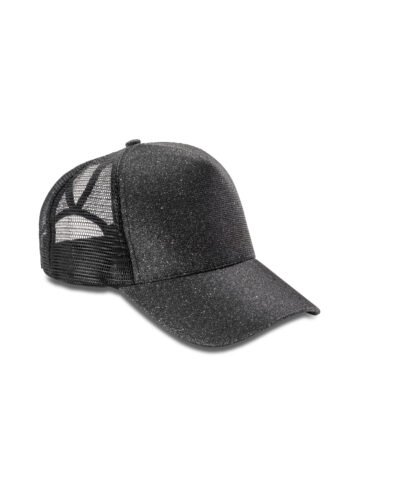 5 panel – 4 mesh & 1 fabric. Stiffened front panel. Tear & release adjuster. Fabric curved peak. Pony tail hole. Recycled PE peak. Tear away label.