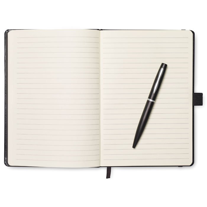 A5 notebook with pen. Hard PU cover. Casebound. 144 lined pages (72 sheets). Matching elastic closure strap, ribbon bookmark and pen holder. Matching metal push button ball pen. Blue ink.