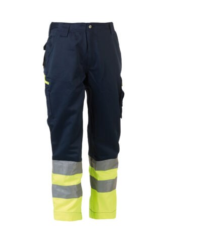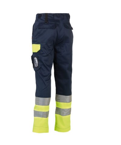 Multi-pocket water-repellent trousers with 7cm reflective tapes around the ankles. Adjustable waistband. 1 loop with key ring. 2 side pockets. 1 mobile phone pocket. 1 thigh pocket. 1 ruler p