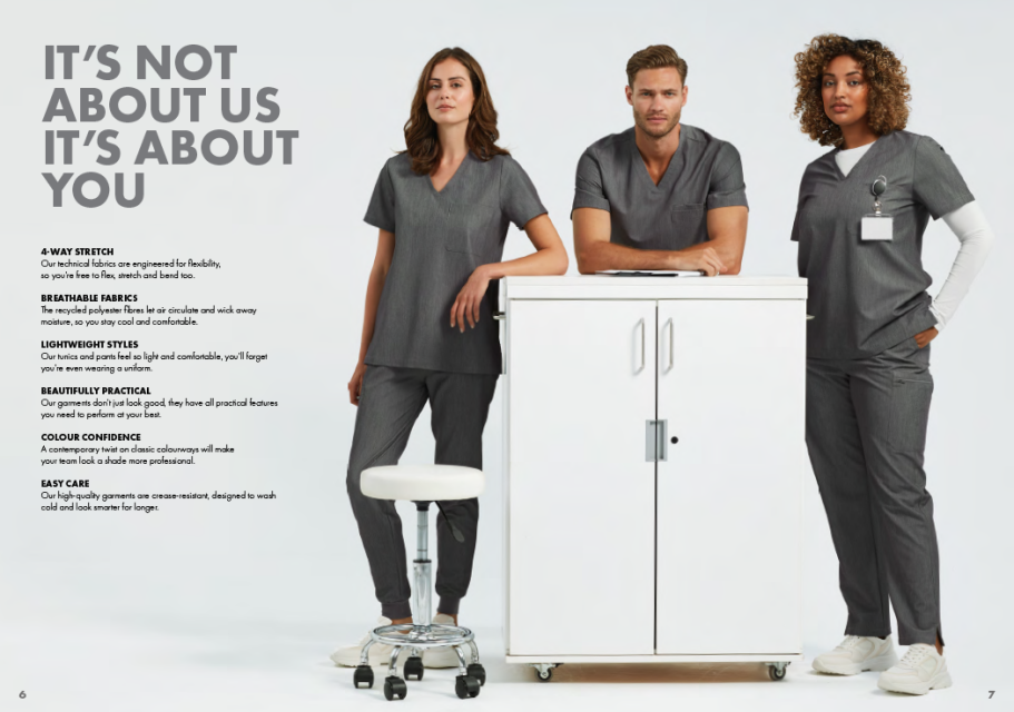 The brochure contains the following:;- Sustainability journey;- Colours;- Products range;”The workplace is changing. Forget cold and clinical. Health and beauty is a dynamic. fluid and amazingly technical industry and we think the uniforms you wear should be too. So. we’ve put our heart and soul into creating the perfect range of uniforms designed for today’s health and beauty professionals. And we know you’re going to love the results.”