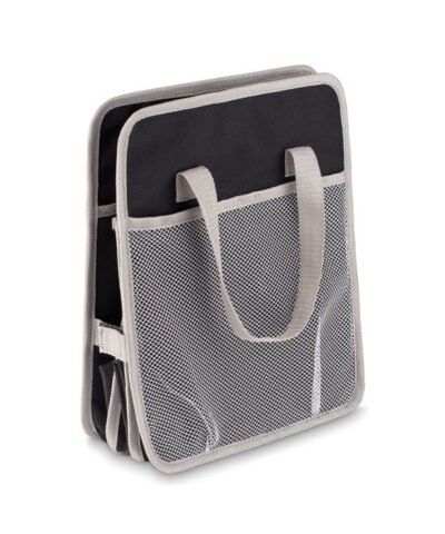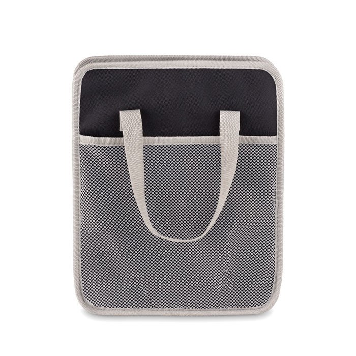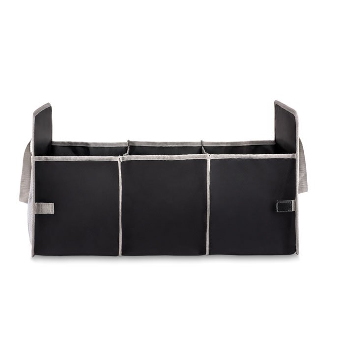 Foldable car organizer in 600D polyester with mesh pocket on side. When not in use, you can fold this up for compact storage. Also, this makes driving safer as it will prevent items from possibly rolling under the drivers feet.