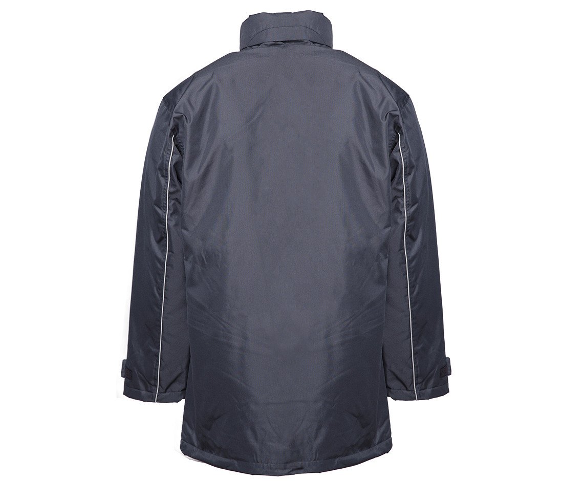 Windbreaker with waterproof coating. 2 outside zipped pockets. 2 inside pockets. Oxford hood in collar. Fleece lined collar. Hook and loop tab on sleeves. Access for customization. Reflective