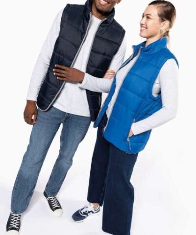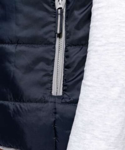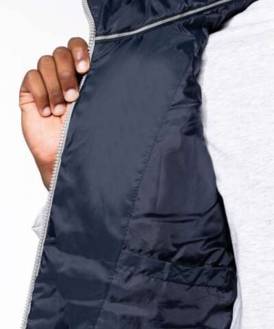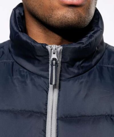 Outer: 100% polyester ripstop with acrylic coating;Polyester inner padding;210T polyester lining;Comfortable and modern;2 zipped outer pockets;1 inner pocket with tear release fastening;Grey contrasting zip and Grey contrasting binding at front opening. pockets and hem;1 zip at chest and 1 zip at hem for decoration access;