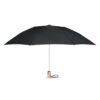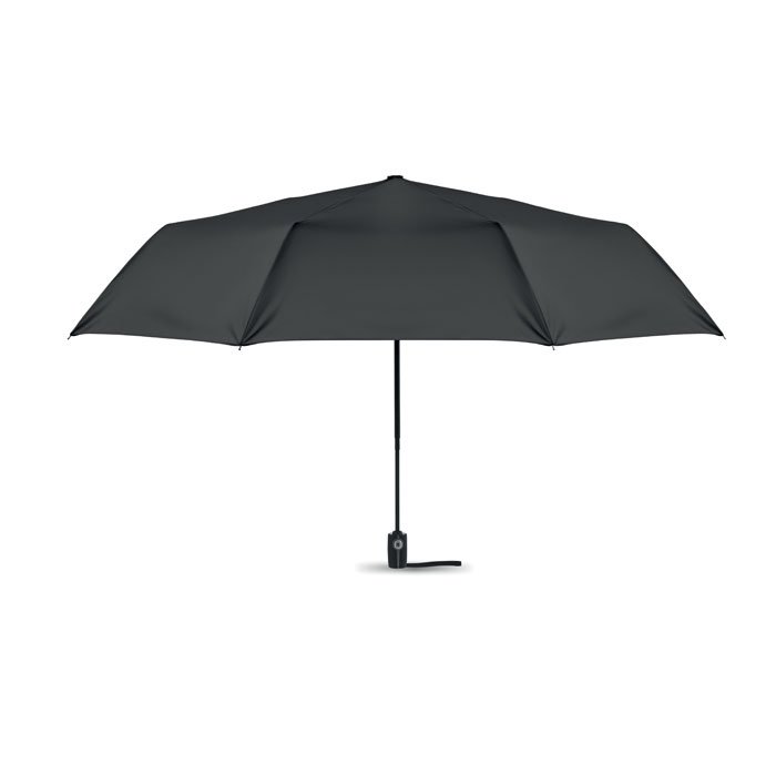 27 inch 3 fold auto open/close windproof umbrella. 190T pongee material black plated steel shaft. Fibreglass ribs, 1 part black plating inside frame. Black PP handle with button. With matching pouch.