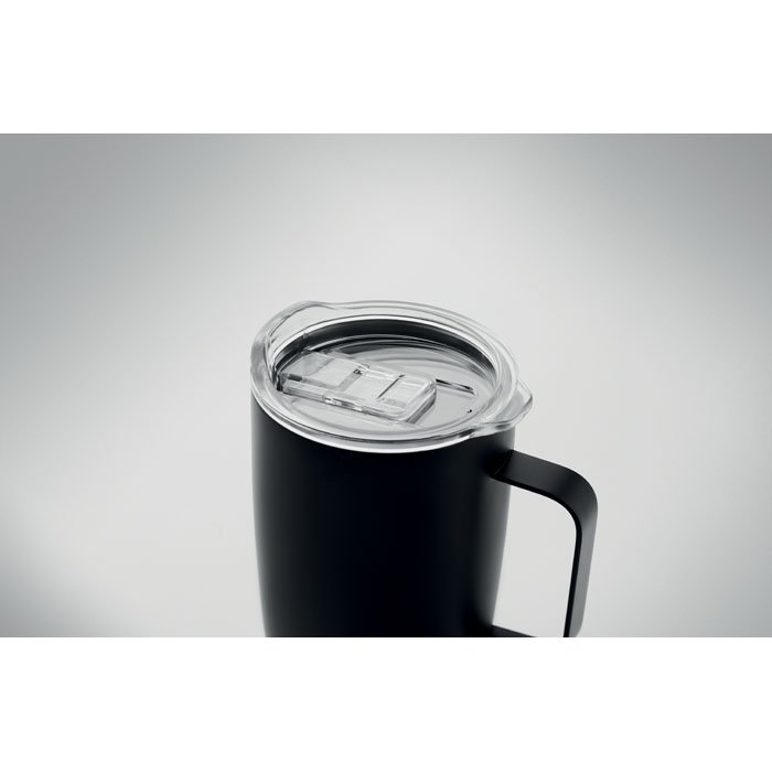 Double wall stainless steel mug with cork base and sliding sip hole cover. Capacity: 300 ml. Cork is 100% natural material. Due to its structural nature and surface porosity the final print result per item may have deviations.