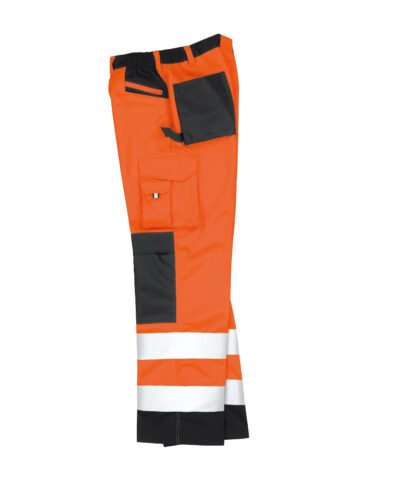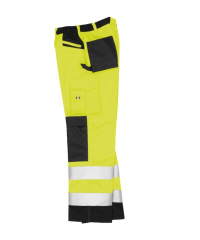 Partially elasticised high waistband with belt loops.Tough & hardwearing with mechanical stretch. 7cm wide reflective safety bands. Top loading knee pad pockets. Dark panels mask grime. Front