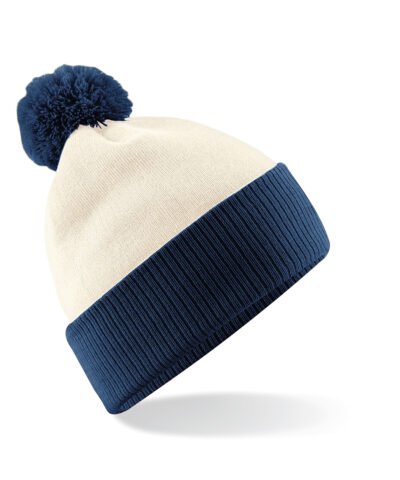 Dual style – Cuffed or slouch. Double layer knit. Ribbed cuff. Contrasting pom pom and cuff.