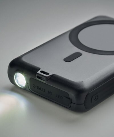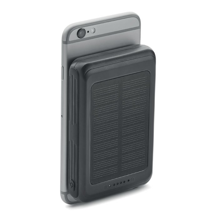 Magnetic wireless charger (5W) Power bank 5000 mAh in ABS and solar panel. Output: DC 5V/2A. Compatible with iPhone® 12 and newer. Including additional magnetic metal ring to support charging of non-magnetic wireless chargeable phones.