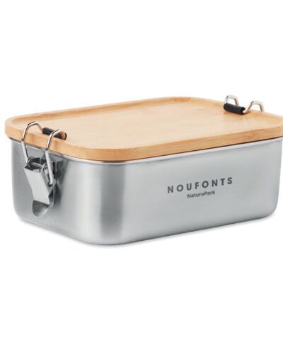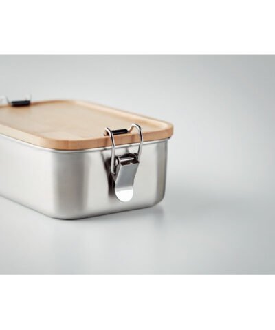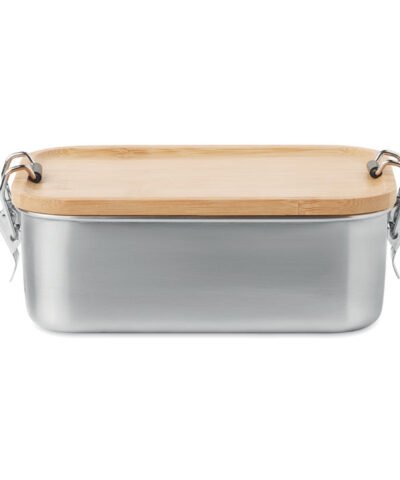Stainless steel lunch box with side closure buckles and bamboo lid. Capacity: 750 ml. Bamboo is a natural product, there may be slight variations in colour and size per item, which can affect the final decoration outcome.