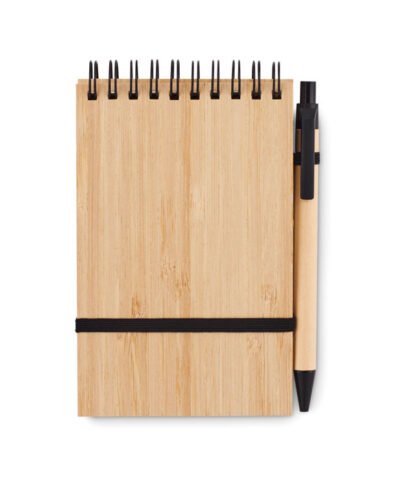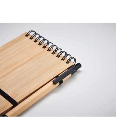 A6 notepad with bamboo hard cover. Twin-wire. 140 plain recycled paper pages (70 sheets). Matching push button ball pen with recycled paper barrel and PLA detailing. Blue ink. Elastic closure strap and pen holder. Bamboo is a natural product, there may be slight variations in colour and size per item, which can affect the final decoration outcome.