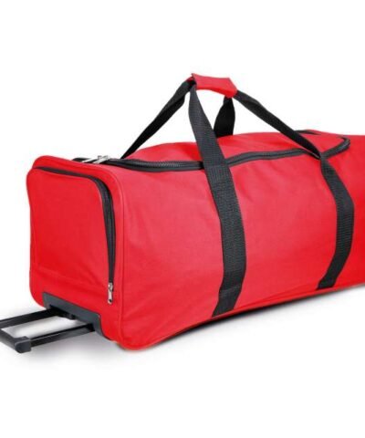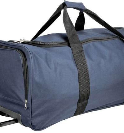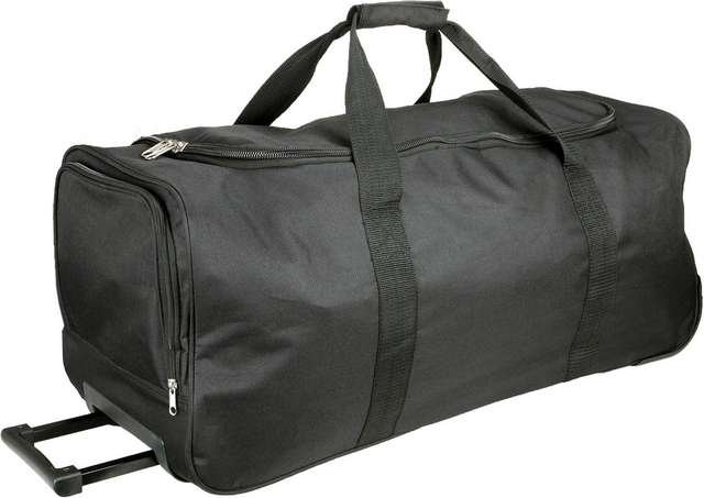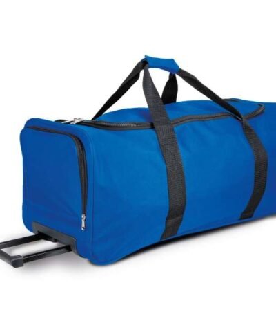 Large sports trolley bag with wheels in 600D polyester;Large top opening;Side pocket shoe holder;Webbing/strap all around the body;