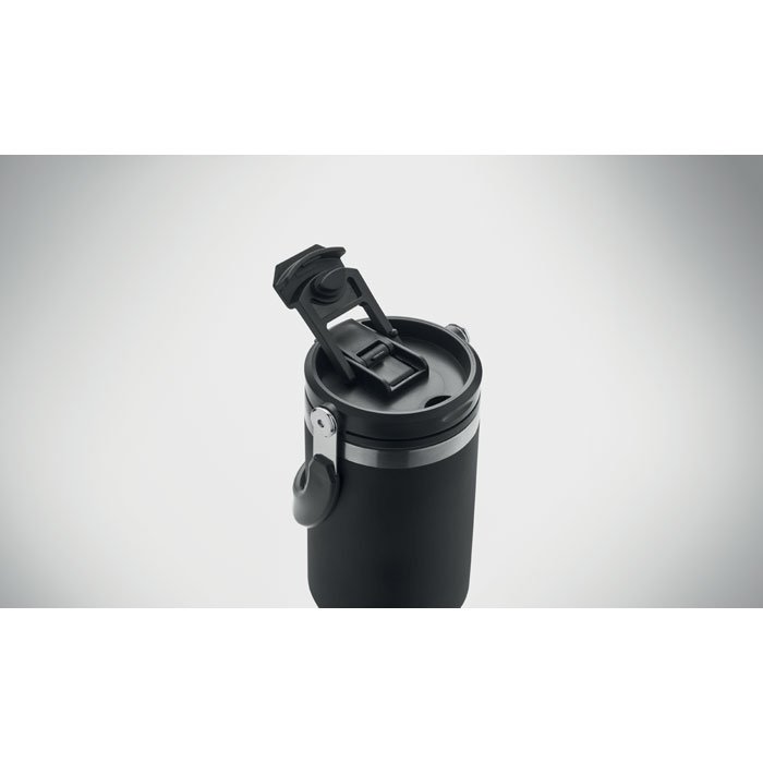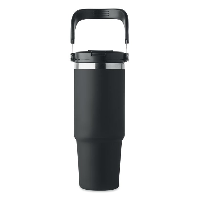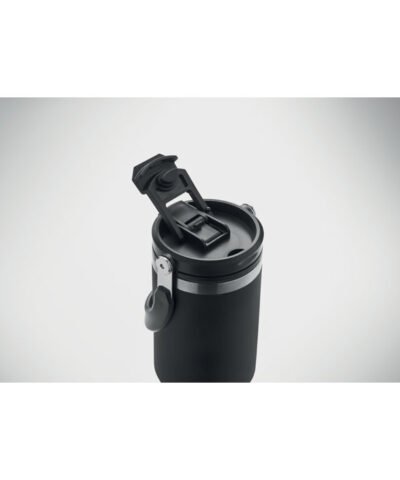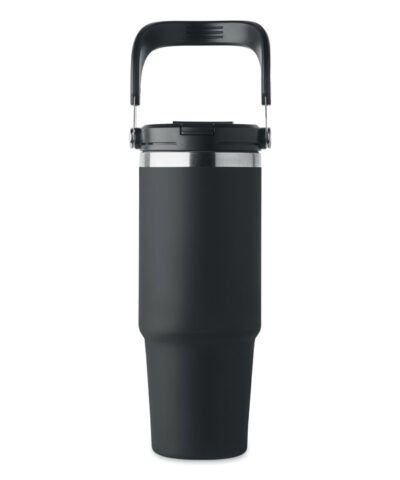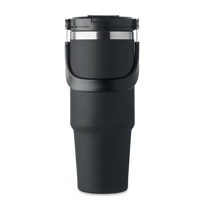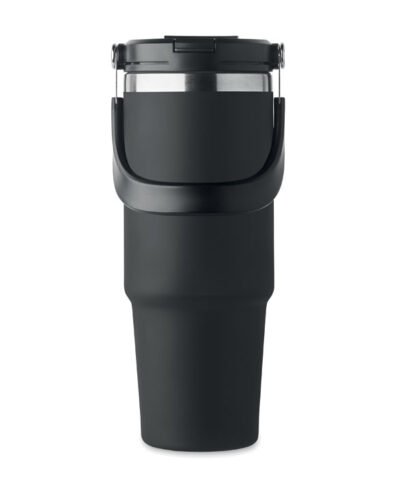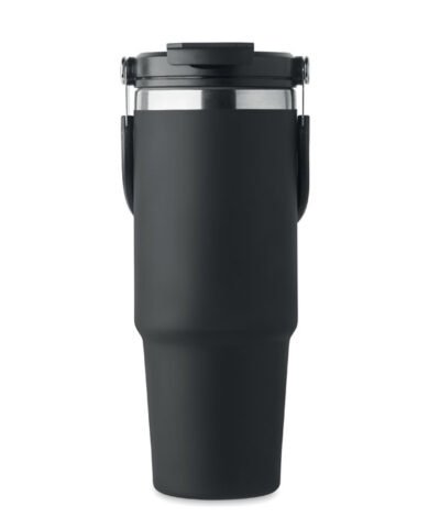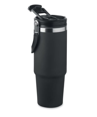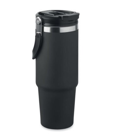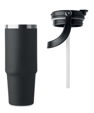 Double wall recycled stainless steel (90% recycled stainless steel and 10% stainless steel) tumbler with lid with inner straw, foldable mouth piece and direct drinking opening . Capacity 850 ml. Leak free.