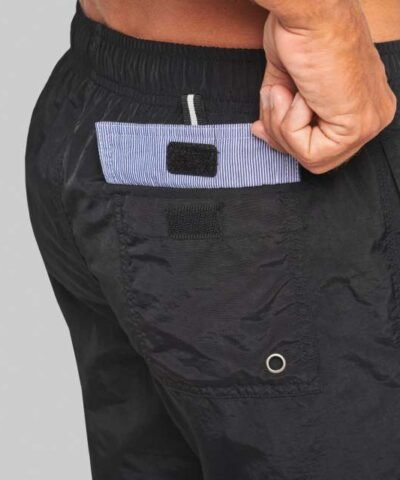 Outer: 100% polyamide – 105gsm;100% polyester integrated mesh knit briefs – 65gsm;Polyester/cotton waist lining – 80gsm;Light fabric;Trendy style;2 side pockets and 1 back pocket with eyelet. flap and tear release fastening;Decorative inner elasticated waistband with drawstring;