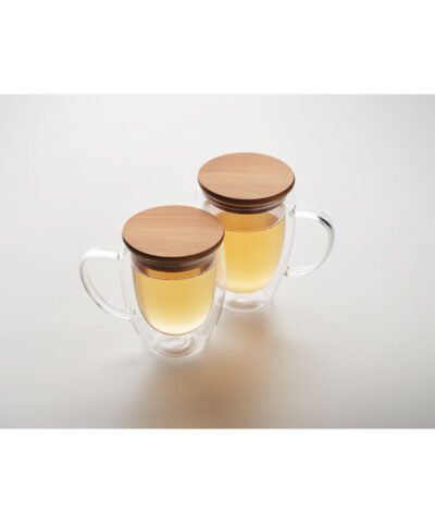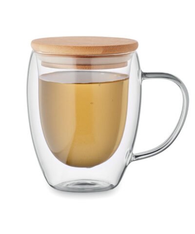 Double wall borosilicate glass mug with handle and bamboo lid. Capacity: 250 ml.
